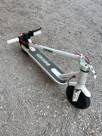 Monopattino elettrico bianco con dettagli rossi, caratteristiche: - motore 350W - velocitá raggiunta di 20km/h con modalità fino a 25 km/h - autonomia dichiarata di 25 km - ruote da 8,5 pollici - freno elettrico anteriore e a disco posteriore - luce anteriore e posteriore - dotato di carica batterie originale - motore/ batteria sostituito originale in garanzia Dettagli dovuti all’usura visibili in foto