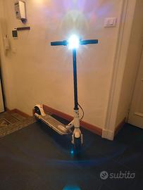 Monopattino elettrico Xiaomi bianco pieghevole con pneumatici solidi usato ma completamente funzionante. Insieme al monopattino sono inclusi il caricatore e un casco anche bianco (come si vede nella foto).