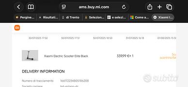 Vendo Xiaomi elettric elite, acquistato a luglio 2025, quindi ancora in garanzia, usato pochissimo, percorsi nemmeno 20 km. Come nuovo. Pagato, come si vede dalla terza foto relativa all’ordine da me effettuato, 339€. Vendo a 210