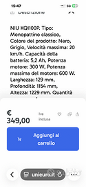 NIU KQI100P. Tipo: Monopattino classico, Colore del prodotto: Nero, Grigio, Velocità massima: 20 km/h. Capacità della batteria: 5,2 Ah, Potenza motore: 300 W, Potenza massima del motore: 600 W. Larghezza: 129 mm, Profondità: 1154 mm, Altezza: 1229 mm.Prezzo trattabile potete venire a vederlo