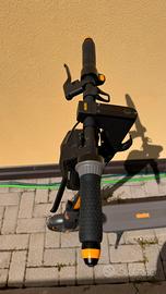 Il monopattino elettrico Ninebot Max G30 è un modello robusto e performante prodotto da Segway-Ninebot. Ha già le modifiche richieste dalla Normativa in vigore : ripartizione freni, freno davanti e freno dietro divisi. Frecce sulle manopole. Specifiche Principali •Motore: Potenza nominale 350 W, massima 700 W (brushless, trazione posteriore). •Velocità massima: 25 km/h (limitata per normativa UE). •Autonomia: Fino a 65 km (variabile in base a peso, terreno e stile di guida) Batteria e Ricarica La batteria è da 15 Ah (circa 551 Wh), con tempo di ricarica di 6-8 ore. Supporta il recupero energetico KERS durante la frenata, migliorando l’efficienza. Freni e Sicurezza •Freni: Elettronico rigenerativo (anteriore/posteriore) + a tamburo (posteriore). •Impermeabilità: IP54/IPX5 (resistente a pioggia leggera). •Luci LED anteriori/posteriori, display LED 3.5” e app integrata per controllo. Dimensioni e Portata •Peso: 19 kg; portata massima: 100-120 kg. •Pneumatici: Tubeless da 10 pollici, anti-foratura. •Dimensioni aperto: 116 x 47 x 120 cm; chiuso: 116 x 47 x 53 cm.