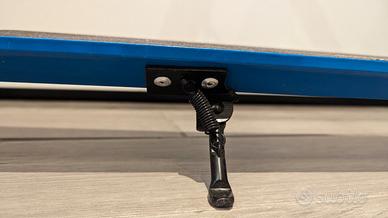 Il monopattino è regolabile in altezza, è richiudibile come in foto, dotato di cavalletto, pedana antiscivolo, e freno a piede posteriore.