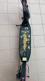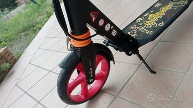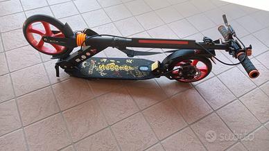 Monopattino regolabile in altezza, con ammortizzatore, e doppio freno (posteriore e leva). Pieghevole e facilmente trasportabile. Cavalletto laterale. Adatto per adulti e bambini portata 100kg. Raggio ruota 20 Cm. Compreso nel prezzo manuale e imballo originale.