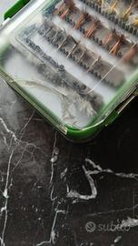 mosche pesca mai usate 77 pezzi la scatola è rotta in un angolo ma funzionante