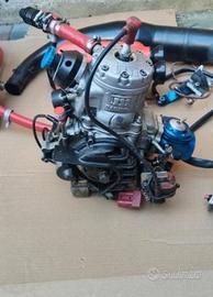 Motore kart TM kf tag 125 completo di accessori quindi carburatore, scarico, piastra supporto e kit cablaggio accensione elettrica con pulsantiera on off e batteria.