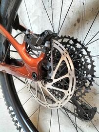 Full suspended, in taglia S, telaio e cerchi in fibra di carbonio e allestita con componentistica di media/alta gamma