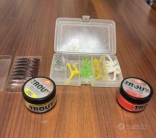 In piu regalo come vedete in foto alcuni artificiali nuovi con scatoletta in plastica e 2 pastelle da innesco per trota lago anche loro mai aperte. Per un’ulteriori informazioni chiedete pure. Vendo in blocco . Non spedisco solo scambio a mano Torino,ho aggiunto in regalo esca artificiale Storm 23 cm come si puo leggere nella foto. Prezzo poco trattabile.grazie