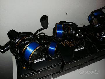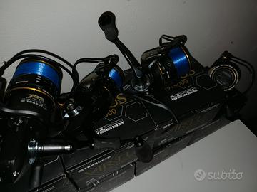 Vendo per inutilizzo n 9 mulinelli Trabucco Virtus 4000, imbobbinati per filo Bomber Blu 0.16 della Tubertini, completi di scatola e sacca porta mulinello. Il prezzo si intende per singolo mulinello