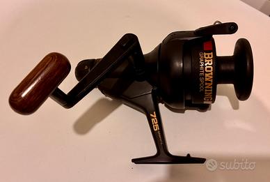 Browning 725 Graphite, mulinello vintage da surfcasting che ha fatto la storia di questa disciplina. Ha bobina in grafite, taglia 725, cuscinetti 4, rapporto 4.2:1 e frizione posteriore. E' un mulinello da collezione ma perfettamente funzionamnte.