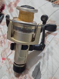Mulinello da pesca vintage Daiwa, in particolare un modello della serie Longcast Spool. Caratteristiche Principali Bobina Longcast: Progettata con un profilo allungato e conico (tapered) per favorire lanci a lunga distanza, riducendo l'attrito del filo in uscita. Frizione Posteriore (Rear Drag): Come indicato dalla manopola nera sulla base e dalla dicitura sulla bobina, questo modello utilizza un sistema di frizione posteriore per regolare la tensione del filo durante il combattimento. Corpo in Grafite: La dicitura "Graphite" visibile sul corpo indica l'uso di materiali leggeri e resistenti alla corrosione, comuni nei mulinelli prodotti tra gli anni '80 e '90. Sistema a Cuscinetti: Spesso questi modelli vintage integrano sistemi a cuscinetti a sfera (ball bearing) per garantire una maggiore fluidità nel recupero.