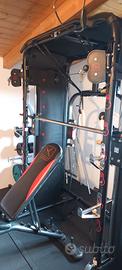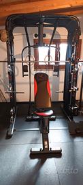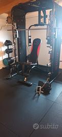 rack multifunzione con Smith Machine , cavi bassi e alti, panca, porta dischi più 100kg di dischi , vari bilancieri.