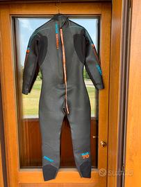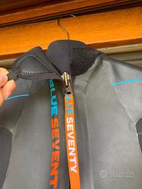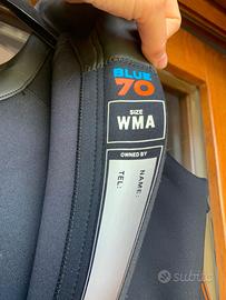 Vendo muta blue 70, comprata l'anno scorso e usata 3 volte (tra cui due volte in gare triathlon). Molto comoda ed ancora in buone condizioni. Come vedete dalle foto nella cavità ascellare è presente un materiale diverso (piu elastico) per permettere una bracciata più libera, comunque non entra acqua. TAGLIA: Medium, io sono 180cm e mi sta giusta in manica e 5cm sopra la caviglia. Vendo con scatola personale e guanti personali. Per altre info contattatemi.