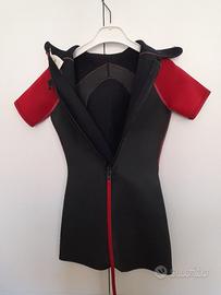 Rossa e nera con cuciture rosa, interamente in neoprene 2-3mm con cerniera posteriore e cordino per sfilarsela da sole. Colletto e cordino chiusi con velcro.