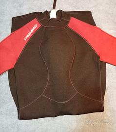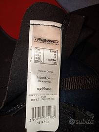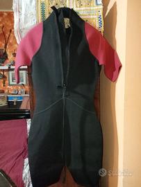 muta corta (shorty) di colore grigio scuro o nero con maniche corte e gambali corti, logo Tribord, un marchio specializzato in sport acquatici. Modello "shorty" con chiusura a zip facilitata da un tirante rosa per una vestizione più agevole in neoprene (spesso 2 mm), ideale per attività come snorkeling, surf o nuoto in acque temperate. collo cavallo 60 cm - vita 30 cm - spalle 40 cm lunghezza totale 90 cm - ascelle 38 cm - si vende così come si vede non ha difetti taglia EUR M
