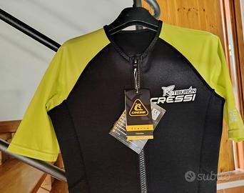 Muta nuova corta, mai usata, con cartellini. Muta corta per adulto, mod. Shorty Tiburon Man, in neoprene 2 mm spessore busto e mezza gamba, in elastam striscia fianchi, mezza manica e colletto. Colore nero e giallo fluo. Con cerniera frontale. Adatta allo snorkeling, nuoto e attività sportive in acqua. Protegge dal sole, dal vento e dal freddo (2 mm neoprene).