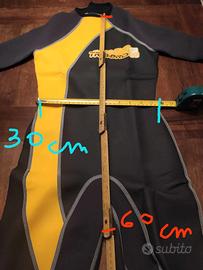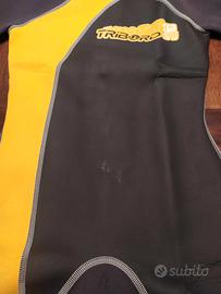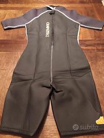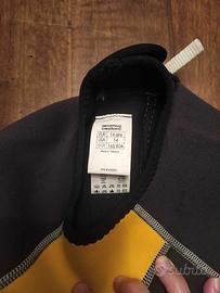 vendo muta da sub corta decathlon marca tribord taglia 14 anni 165/80A. Mai usata ma senza cartellino. Sono evidenti i segni delle piegature. La stampa tribord gialla, rimanendo piegata, ha rilasciato colore e macchiato un po' un punto in zona addome (vedi foto)