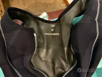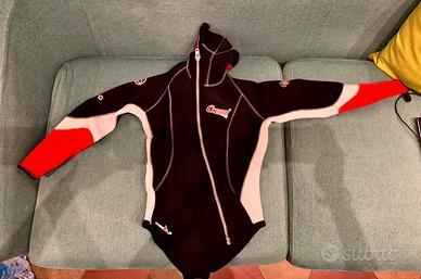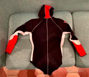Classica muta in due pezzi da donna, realizzata in neoprene bifoderato da 5 mm,giacca con cappuccio incorporato, chiusa inferiormente, con cerniera.