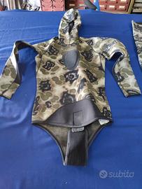 Vendo splendida muta Effesub Camo 35, giacca e pantalone a vita alta foderato esterno mimetico, spaccato liscio interno, spessore 3,5 mm, taglia L/50. Morbidissima ed elastica, usata pochissimo.