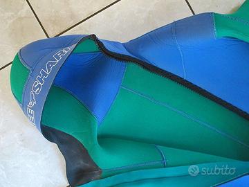 Fotografo subacqueo vende muta Free Shark in pezzo unico con cappuccio incorporato, taglia L, in neoprene 6mm di vivaci colori verde e azzurro, di ottima resa fotografica.