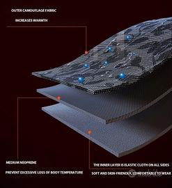 Rinforzi su gomiti, petto, ginocchia e parte posteriore. Neoprene rivestito in tessuto, quindi morbidissimo il che rende facilissimo indossare la muta. Non e' in spaccato.