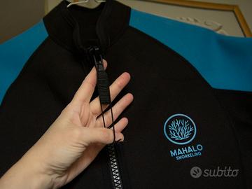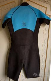 Muta in neoprene da uomo, taglia L. Ideale per sport acquatici come snorkelling o immersioni in luoghi caldi. Spessore 2 mm. Mai indossata in acqua perchè acquistata per errore, non va bene su una donna di piccola statura. - Colore nero e blu. - Maniche corte. - Zip frontale.