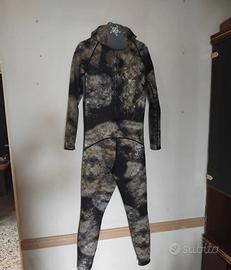 vendo muta 2,5mm monopezzo bifoderato camo con zip posteriore, includo pure il cappuccio della stessa trama mimetica, calzari e guanti sempre 2,5mm TG.M