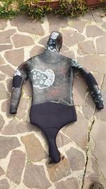 Giacca 7.5 mm, pantalone 6.5 mm, su misura per persona di altezza 187 cm e 93 kg di peso, accessoriata con protezione gomiti, ginocchia e striscia anteriore per caricare il fucile, usata pochissimo, neoprene in ottime condizioni, ad eccezione di piccola lesione in zona lombare destra riparata perfettamente. Prezzo di acquisto 500 euro.