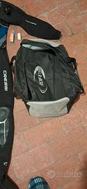 Sacca per la muta e cera per cerniera. calzari rigidi taglia XL.