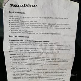 Muta nuova taglia XL mai utilizzata, per problemi di salute. Materiale impermeabile a 4 strati traspirante. Cuciture saldate. Rinforzi in cordura su spalle, gomiti ginocchia e seduta. Mani e collo sono sigillati con polsini in lattice ricoperti da polsini in neoprene. Ai piedi sono presenti calzari uniti alle gambe, rinforzati in cordura. Un'ampia cerniera posteriore che termina nella parte anteriore, facilità l'ingresso della muta. Una piccola cerniera tra le gambe aiuta ad alleviare alla pressione sulla sacca durante la navigazione. Maggiori dettagli li trovate sul sito SANDLINE. Valore attuale € 880. La svendo € 600. leggermente trattabili.