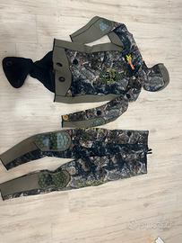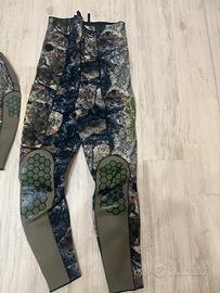 Realizzata in neoprene Sheico internamente a celle aperte ed esternamente foderata con trama in Nylon e con mimetizzazione 3D, la muta C4 Extreme Camu, che abbiamo ricevuto nello spessore di 6,5 mm, ma disponibile anche in 3 e 5 mm, è una soluzione abbastanza tradizionale, ma con alcune caratteristiche interessanti che migliorano le prestazioni complessive e hanno potenzialmente un occhio di riguardo anche all'ambiente. Le protezioni sulla muta C4 Extreme Camu sono presenti sul petto, con un strato aggiuntivo di neoprene e una protezione stampata in gomma, con funzione antiscivolo, e sulle ginocchia con una copertura in Supratex. Sui gomiti non sono presenti protezioni aggiuntive, quindi l'unica copertura è la fodera esterna presente su tutta la muta. C4 Extreme Camu sternal protection La parte inferiore della giacca è foderata anche internamente nella zona frontale dove sono posizionate le clip per la chiusura della coda di castoro, ottenendo una soluzione più robusta.