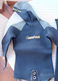 Vendo muta Cressi Sub due pezzi, spessore 5 mm nera in ottime condizioni. Taglia III (M). No strappi, no scuciture, polsini in gomma perfetti. Per nuotate in superficie, in estate può essere sufficiente indossare anche solamente il pezzo di sopra (se non si è freddolosi). Disponibile per altre foto, info e dettagli.