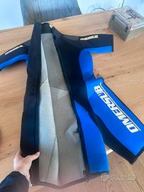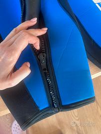 Modello shorty manica e gamba corta con cerniera frontale intera che va ad aprire totalmente sulla parte destra , spessore 5 mm, colore blu e nero con logo giallo e bianco, realizzata in neoprene per immersioni o attività acquatiche in acque temperate ( size 1) (xs)taglia 40 per altezze tra tra i 152/158