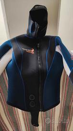 Vendo muta subacquea da donna Mares Thermic Lady, un modello classico e affidabile. La muta è formata da due pezzi, un salopette e una giacca con cappuccio integrato. Spessore: 5 mm. Taglia: 4 (equivalente a una M/L, circa 170-175 cm di altezza).