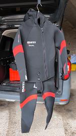 Muta umida Mares modello Dual da 5 mm e in due pezzi, salopette e giacca con cappuccio. La muta non è mai entrata in acqua pertanto è da considerarsi nuova, tant'è che è fornita di pezze in neoprene per eventuali rattoppi. La taglia è la 5.