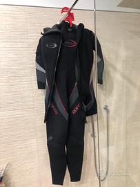 Mita umida donna ROFOS Favola 5+5mm. Muta umida da 5mm misura 4^+ mutino 5mm con cappuccio misura 4^ + cappuccio 5mm misura 5^. Si puo’ indossare la sola muta lunga 5mm con cappuccio separato, il solo mutino short 5mm con cappuccio integrato oppure in abbinamento, per avere una muta 10mm sul tronco.