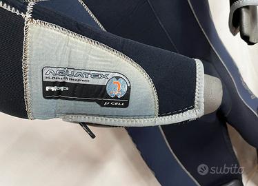 Utilizzo, immersioni in acque fredde, cerniera (da sostituire) orizzontale sulle spalle per minori infiltrazioni d’acqua, materiale in neoprene con tecnologia AquaTex con rinforzi su ginocchia e gomiti.