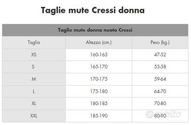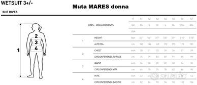 Per le specifiche misure fare riferimento alla tabella Mares allegata, tenendo presente che la muta è un po' più piccola della taglia nominale standard