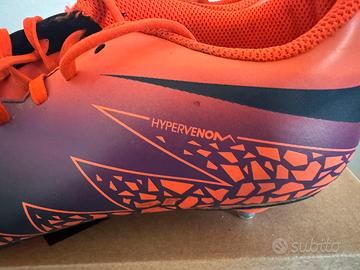 Nike Hypervenom, vendo per inutilizzo. Ancora in perfette condizioni. Con tacchetti in ferro ideali per essere usati su terreni fangosi o comunque in caso di pioggia. Non ho la scatola originale e la chiave per staccare i tacchetti.