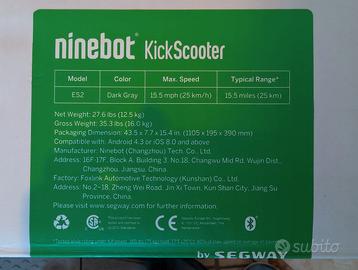 Monopattino elettrico Ninebot ES2, doppio freno disco davanti e a frizione dietro. Firmware originale, velocita' massima 25 Km/h. Poco usato e ben conservato, sempre in casa. Comprende scatola e caricabatterie originale. Vendo causa inutilizzo dopo trasferimento. No spedizione, ritiro a Como citta'.