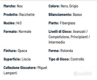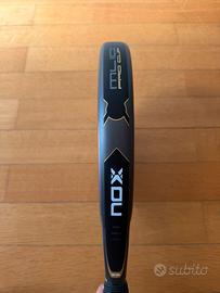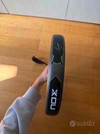 Racchetta Nox come nuova, presenta un graffietto superificiale nella parte superiore da come si vede in foto ma nulla di che, usata un mese Caratteristiche: Forma rotonda con bilanciamento basso e ampio punto dolce Peso che oscilla tra i 360-375 grammi per un'incredibile maneggevolezza Nucleo HR3 ad alta densità ed effetto memoria che potenza il colpo Facce di Fiber Glass Silver: rigidità media con uscita di palla eccezionale telaio 100% carbonio per maggiore durabilità e resistenza all'usura Progettata in Spagna