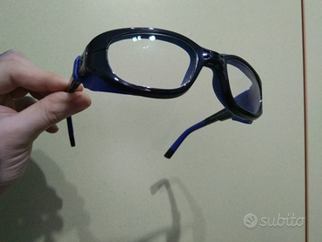 Colorazione blu e nera, l'occhiale è in dotazione con la sua custodia imbottita e la possibilità di montare sia le asticelle classiche, sia un elastico da agganciare dietro la testa.