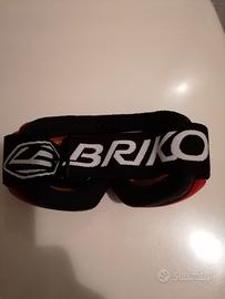 Occhiali da sci bambino marca BRIKO, lente arancio montatura rossa Elastico nero. Completo di busta di protezione.