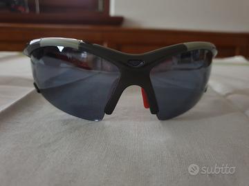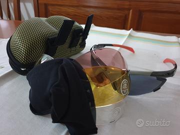 Occhiali protettivi, 4 paia di lenti intercambiabili (da trasparente a scuro), due delle quali mai usate (ancora col bollino attaccato). Custodia rigida con ganci per fissaggio al telaio e contenitore di stoffa per le tre lenti non in uso