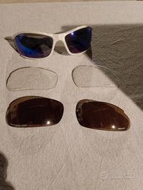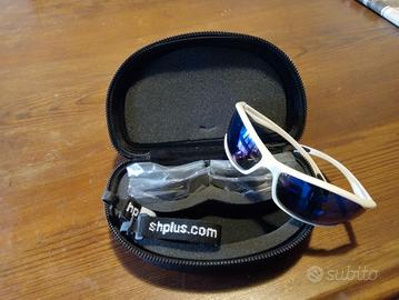 Occhiali multisport marca Shplus. Bianchi con lenti azzurre, intercambiabili con le altre disponibili, trasparenti e marroni.