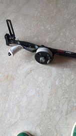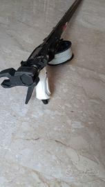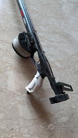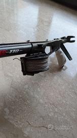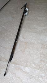 Fucile Omer Invictus carbon 110 con asta da 145 cm x 6,75 mm e mulinello Match 90, con braccetto abbattibile, completo di sagolino da 1,5 mm. L'impugnatura è dotata di staffa per il montaggio di action cam, facilmente abbattibile per agevolare il caricamento. Il fucile viene venduto senza elastici a € 200 o con tre elastici circolari, completi di archetti in dyneema a € 230