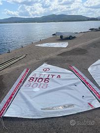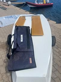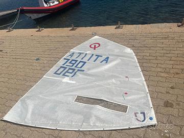 Optimist in ottimo stato, perfetto per cominciare ad allenarsi e regatare. Completo di timone e deriva con sacca, alberatura, riserve di galleggiamento, cinghie e scotta praticamente nuove, carrello, vela One per pesi leggeri e vela One HP.