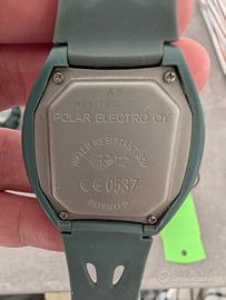 Modello: Si tratta del Polar A5. È un modello entry-level dei primi anni 2000, molto popolare per la sua semplicità d'uso. Design: Presenta una cassa in plastica verde scuro/grigio con una lunetta argentata intorno allo schermo LCD. Ha un unico grande pulsante frontale (per avviare/fermare le sessioni) e pulsanti laterali per navigare nel menu. Resistenza all'acqua: Il fondello indica Water Resistant 30M, il che lo rende adatto a schizzi e pioggia, ma non è consigliato per il nuoto intensivo.