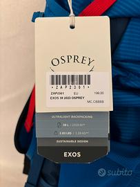 Vendo zaino da escursione ultraleggero Osprey Exos 38L blu, taglia schienale L/XL (49,5 - 58,5 cm) Nuovo con cartellino