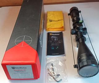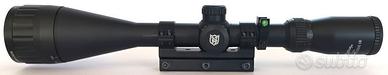 Ottica Nikko Stirling Mountmaster AO, 4-16x50, con correttore di parallasse e reticolo illuminato Half Mil Dot. Regolazione a 1/8 di MOA. Messa a fuoco a partire da 10 yarde. Lunghezza 37,59 cm. Tubo da 1" (25,4 mm). Corredato di slitta per scine da 11 mm, anello di livella a bolla e tappi coprilente.