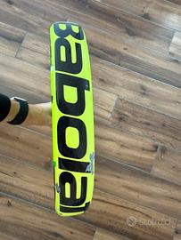 La racchetta si presenta come in foto con qualche scheggiatura data dal normale uso e una crepa da contatto con il vetro che però non ne compromette la funzionalità.